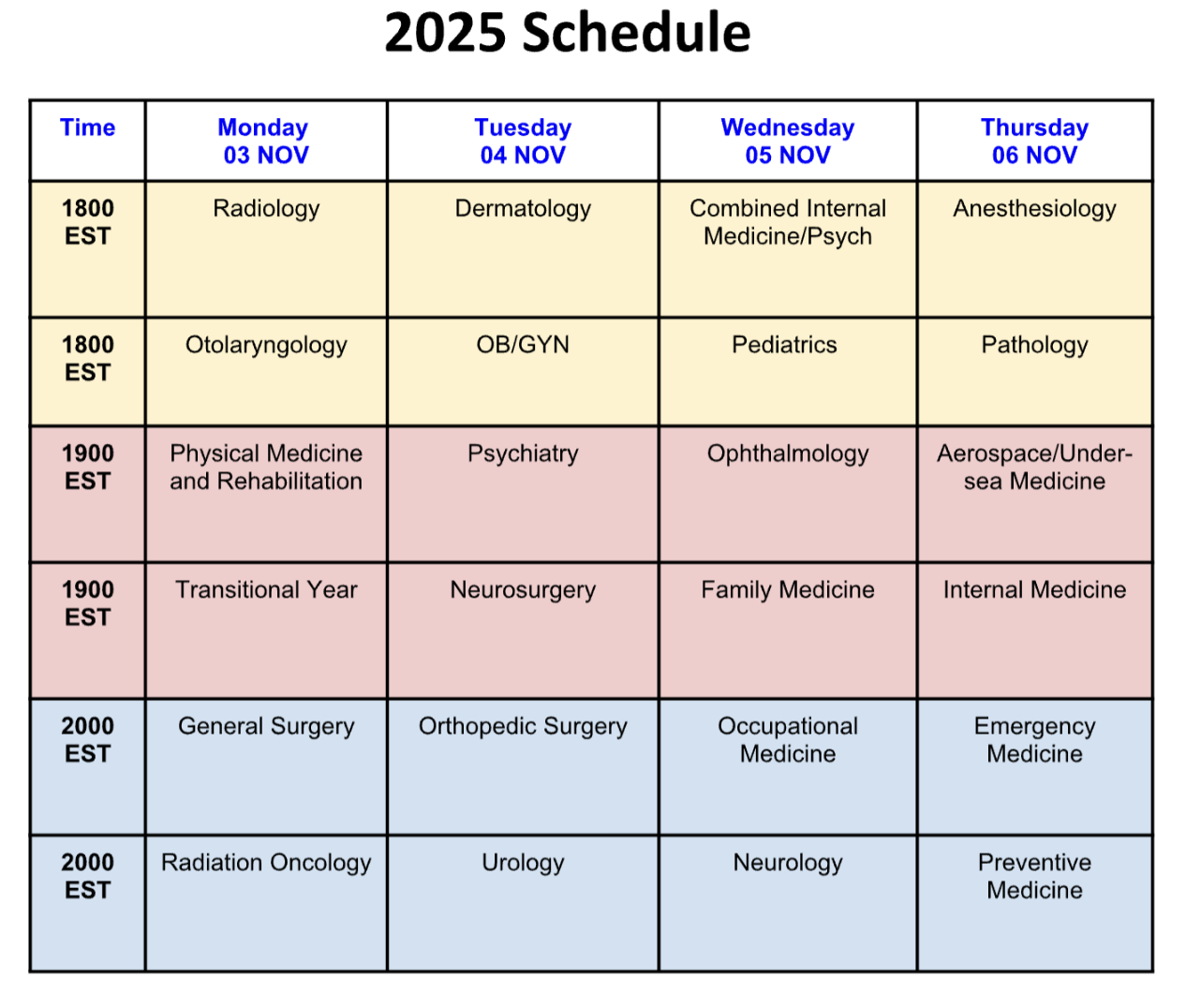 Above is the list of meetings for each night of the week. Before the session starts, use the Zoom link below to join the joint meeting. Once the meeting date has passed, you may click on the updated links to access the recorded meeting. Certain meetings are separated by military branch due to the number of participating programs but will use the same initial Zoom link.
